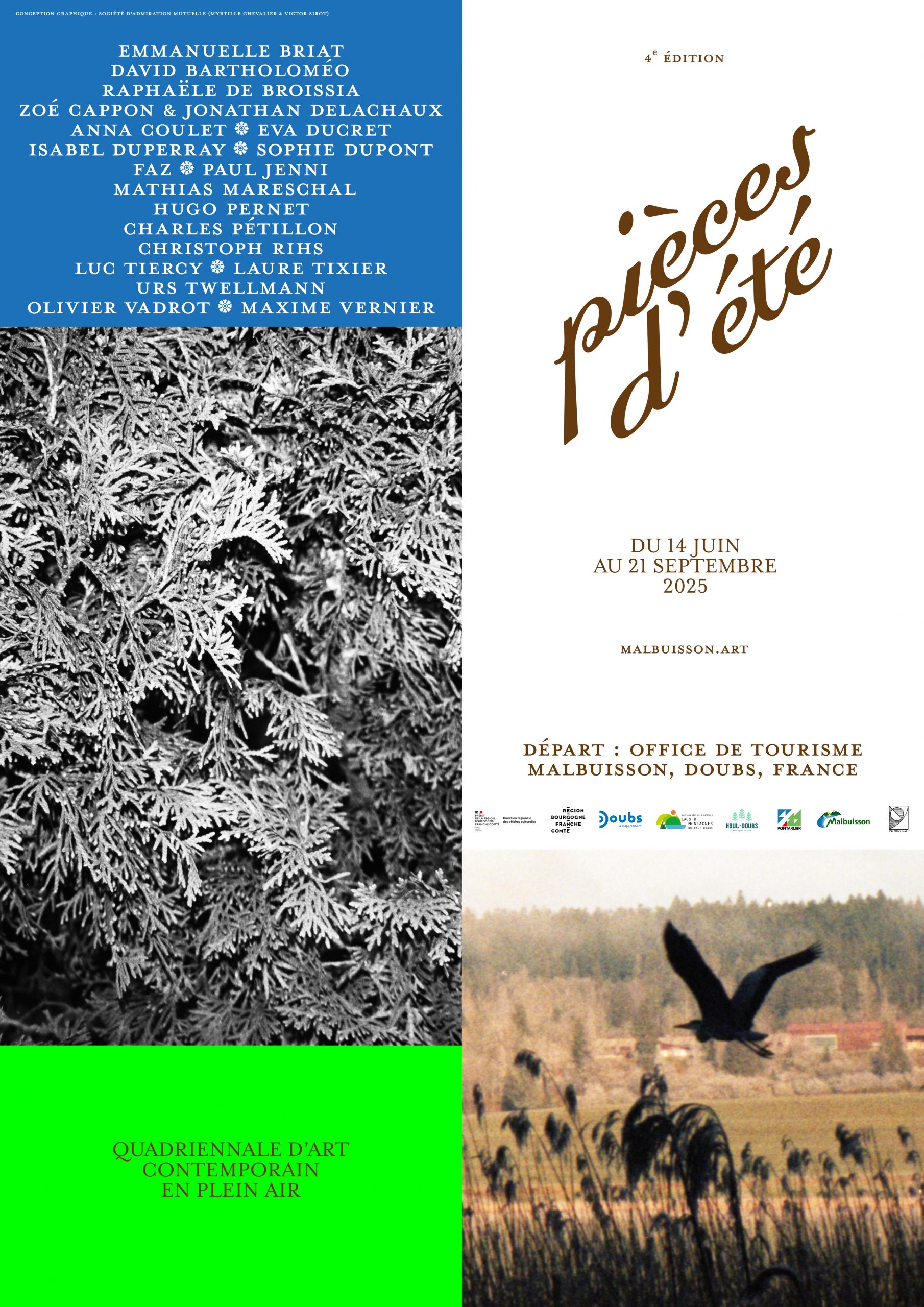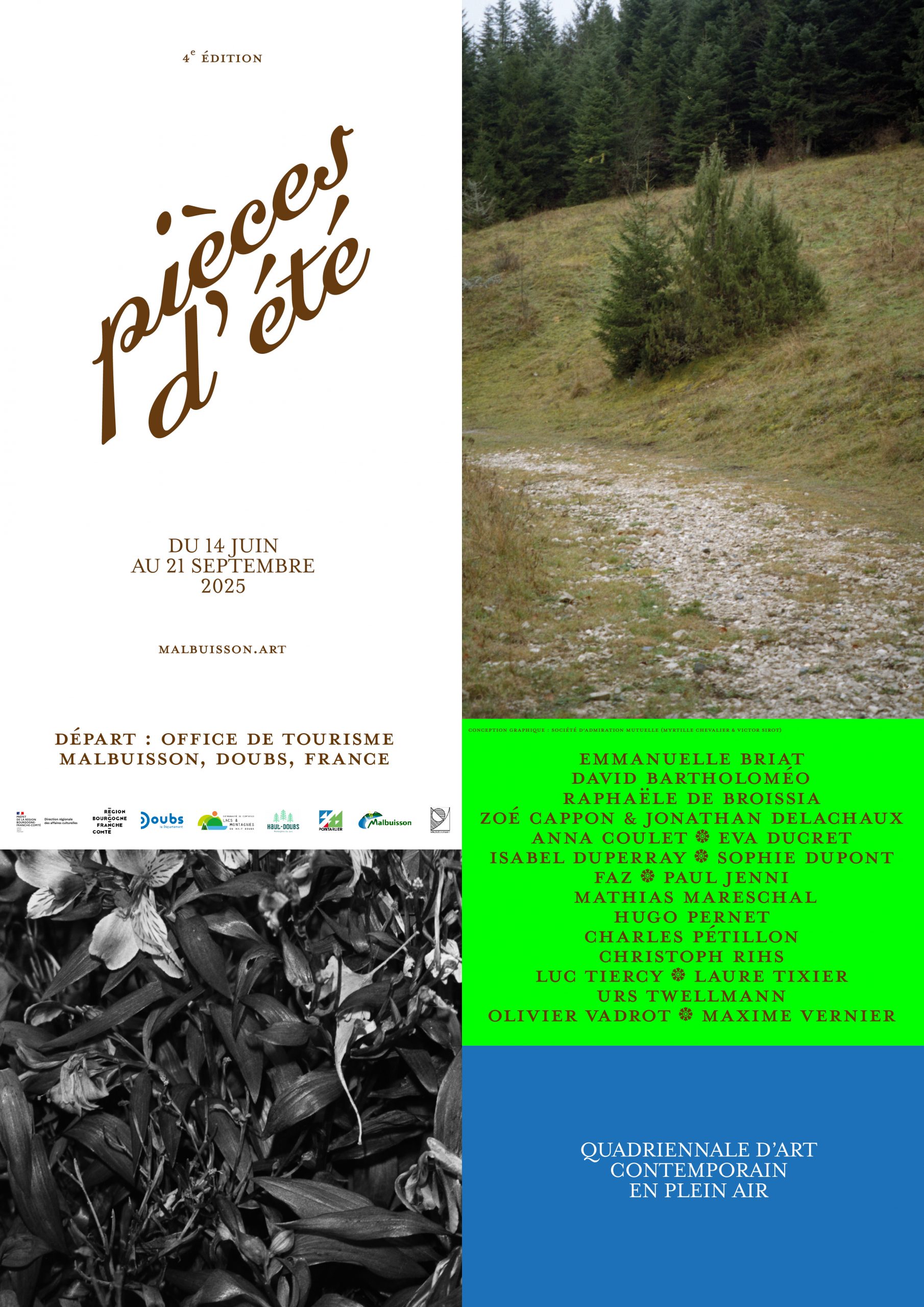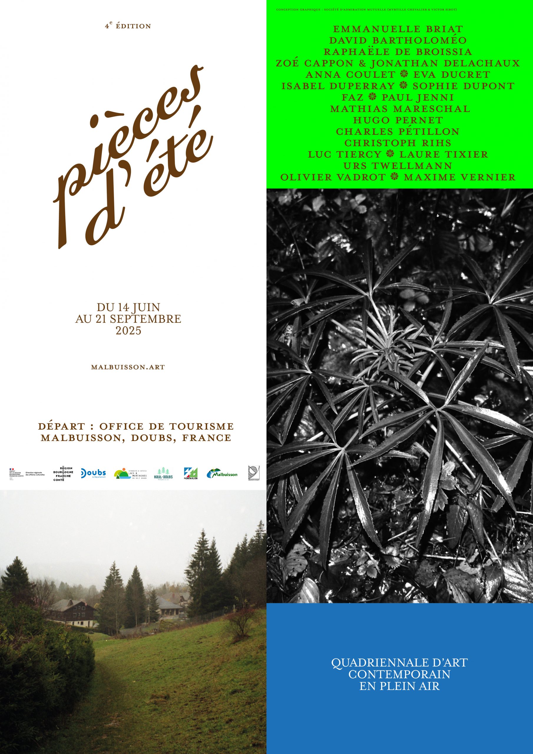 Les artistes présents en 2025 Anna Coulet Charles Pétillon Christoph Rihs David Bartholoméo Emmanuelle Briat Eva Ducret Faz Hugo Pernet Isabel Duperray Laure Tixier Luc Tiercy Mathias Mareschal Maxime Vernier Olivier Vadrot Paul Jenni Raphële de Broissia Sophie Dupont Urs Twellmann Zoé Cappon et Jonathan Delachaux Plan, logo et guide en 2025