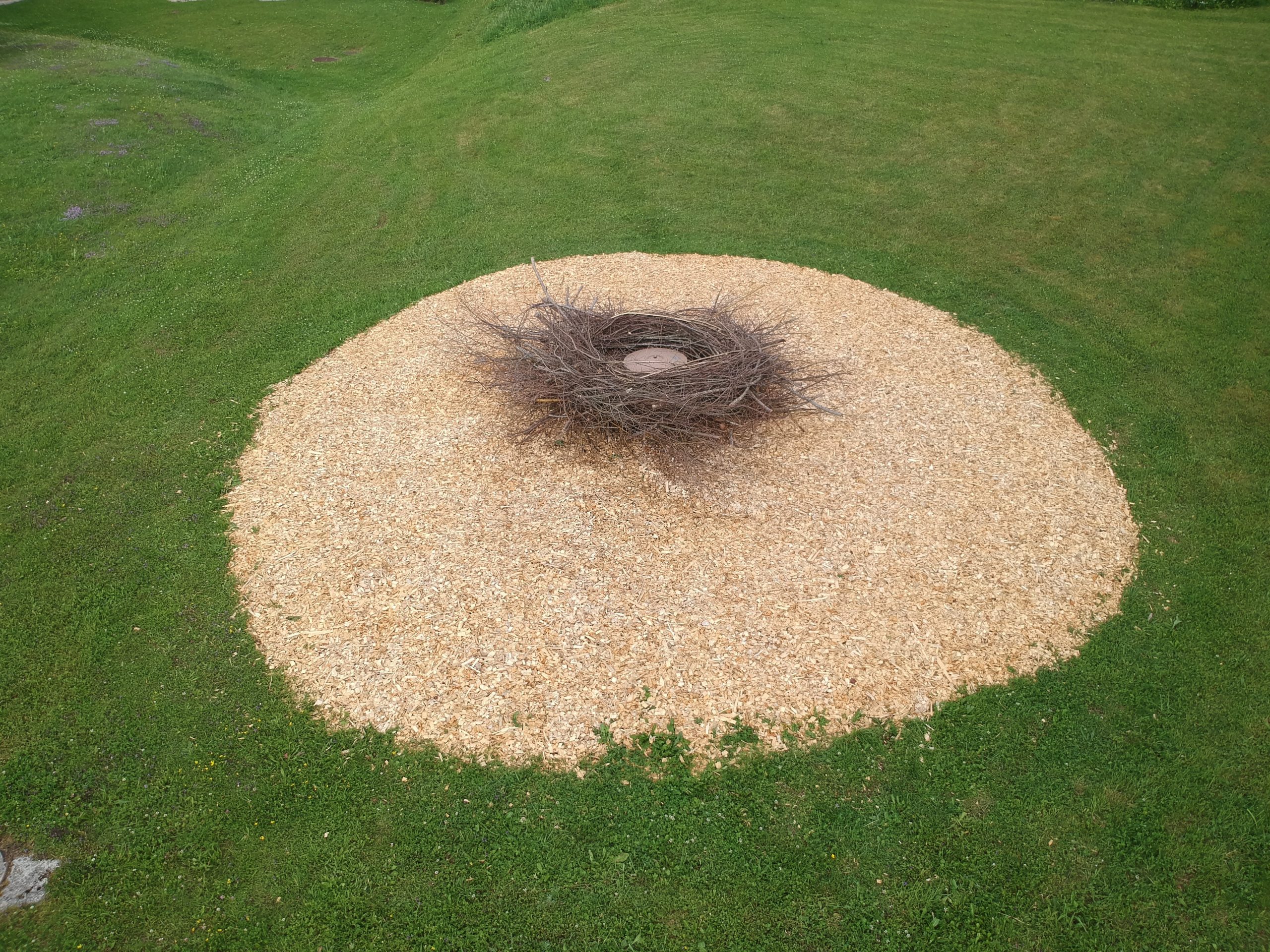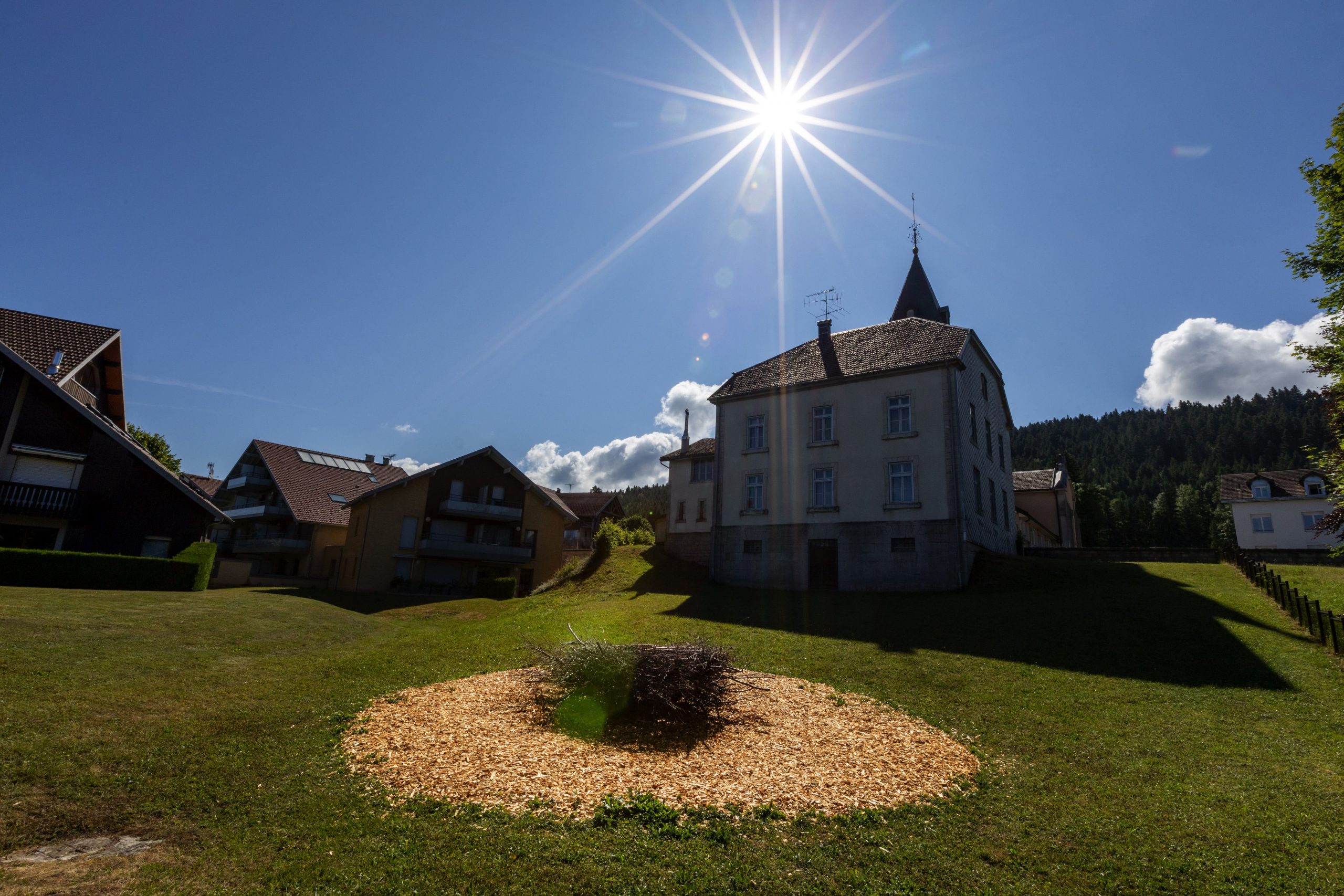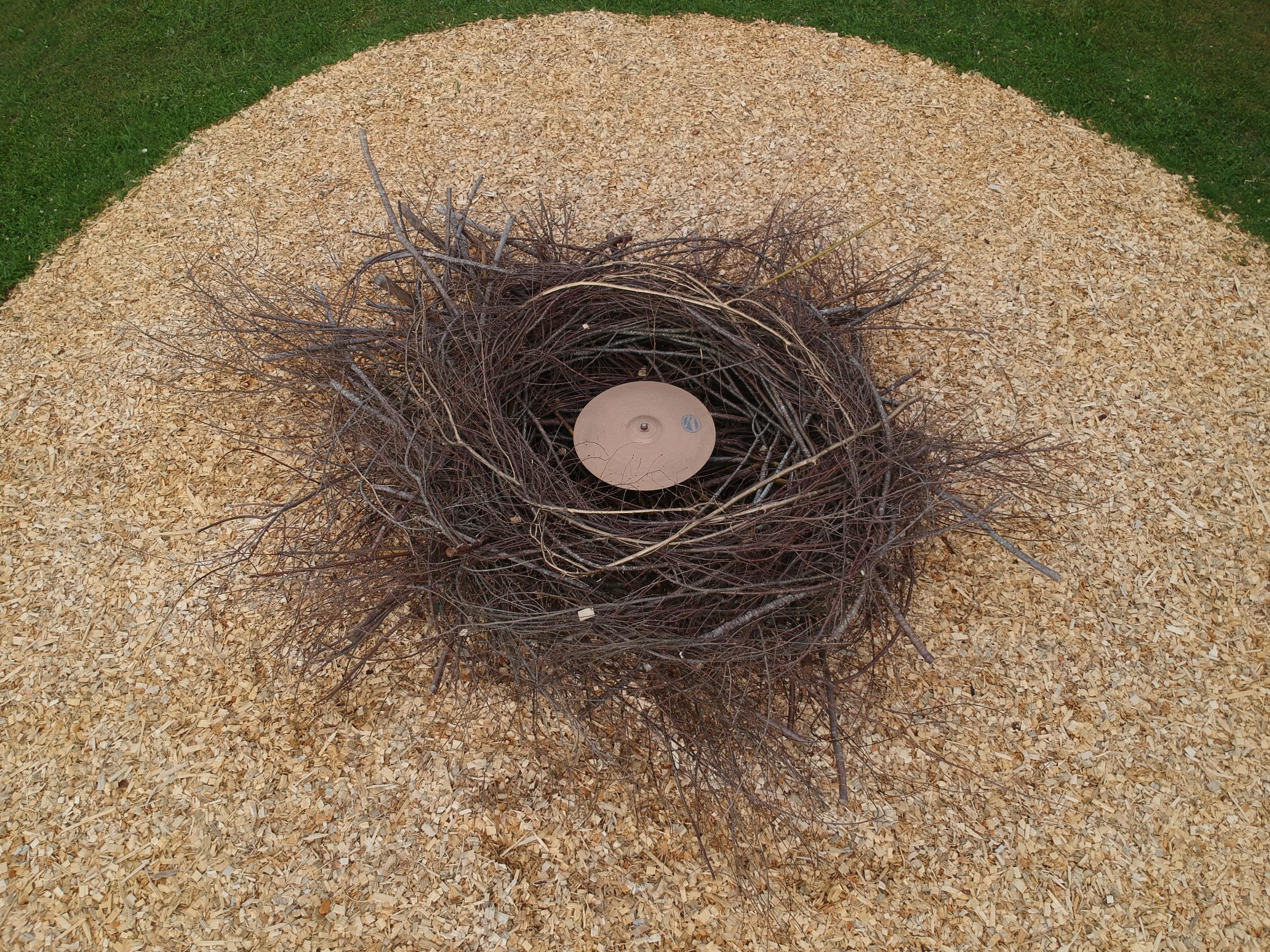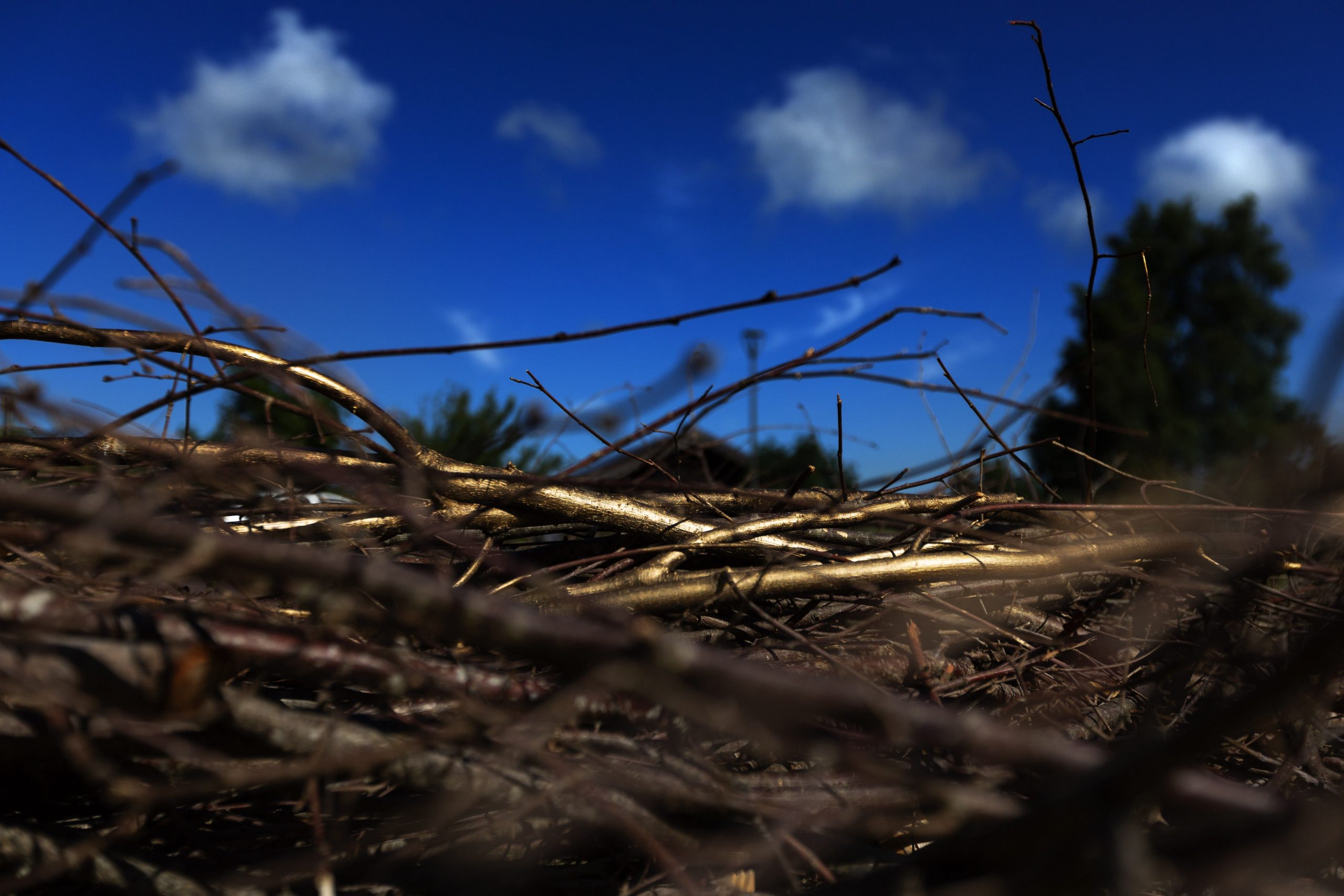 300 cm x 300 cm, Branches, racines calcinées, cymbale, paraffine dorée, 2025.