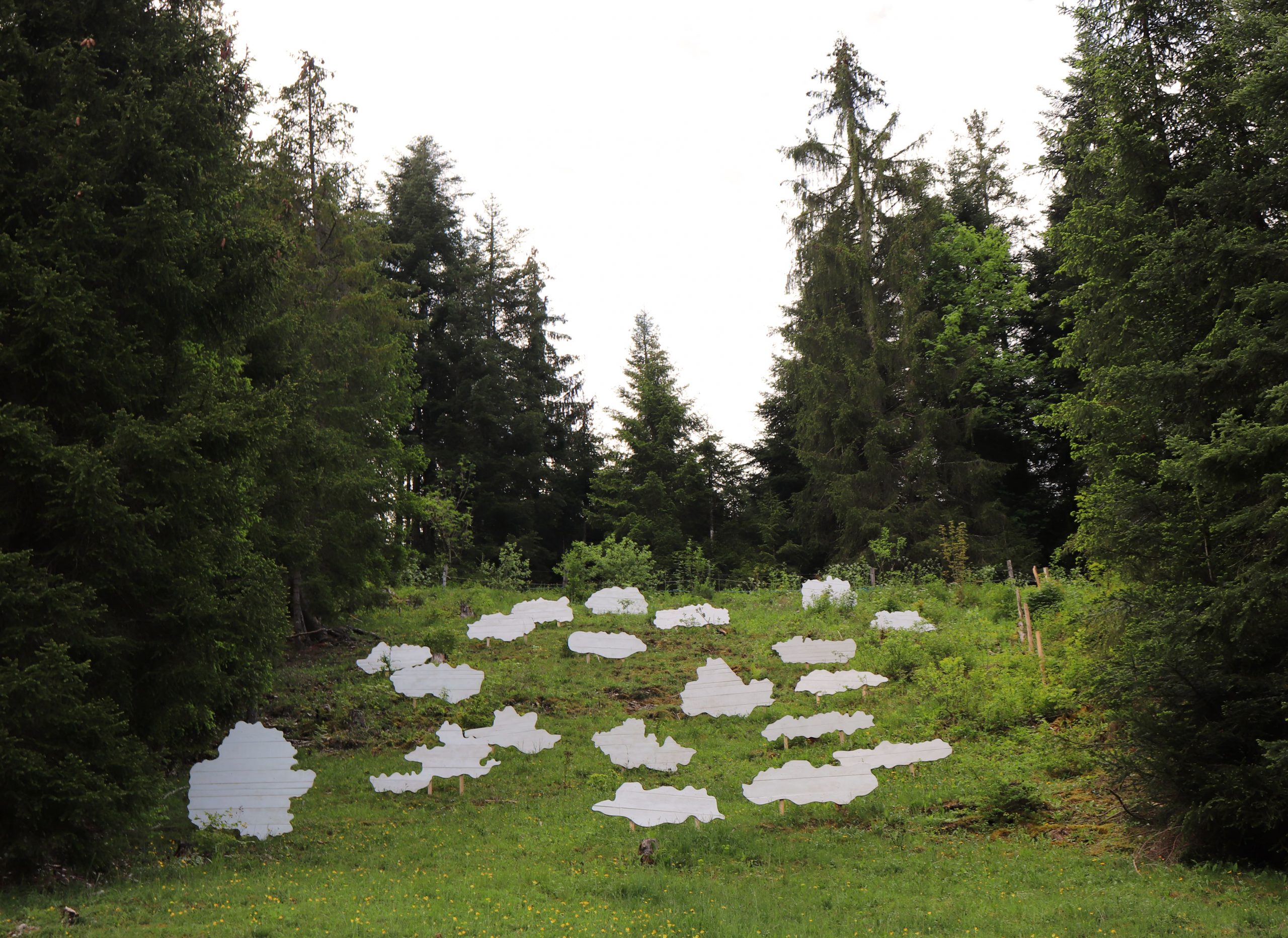 Série de 20 nuages, dimensions variables : entre 1m et 1,50m, superficie au sol 400m². Planches de sapins, peinture blanche, tasseaux de bois, 2021.